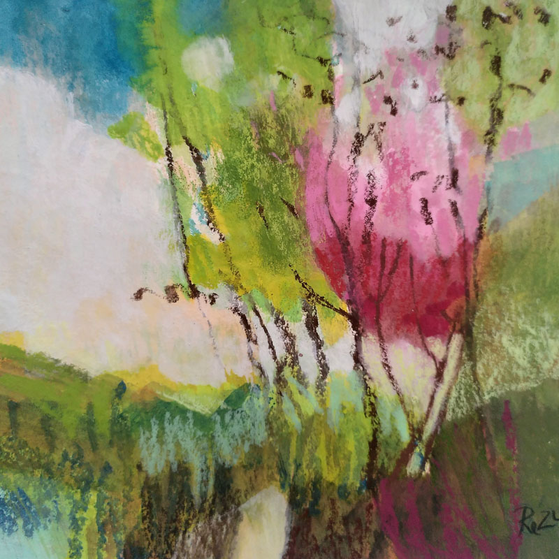 Dem Malen geht bei Gabriele Renz ein staunendes Betrachten der Naturphänomene voraus. Sie liebt es täglich durch die Natur zu schlendern und Farb- und Lichtsituationen wahrzunehmen. Mitunter wird vor Ort gezeichnet, um den Formenschatz zu heben oder auch einfach um ganz am Ort anzukommen und im Zeichnen eine Möglichkeit der inniglichen Begegnung zu haben. Im Atelier wiederum werden aus den gesammelten Eindrücken kleine oder großformatige Bilder. Sie bilden niemals genau ab, sondern vermitteln in frei flutenden Farbflächen und bewegten Linien den bleibenden Eindruck der Wahrnehmungen. Mit Freude und Respekt geht es an die Tuben und Tiegel.